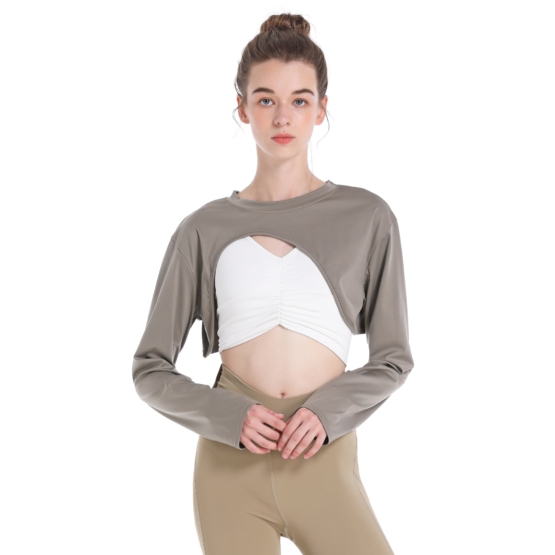 – Design type: Stylish long-sleeve crop top with round neck. White crop top not included.