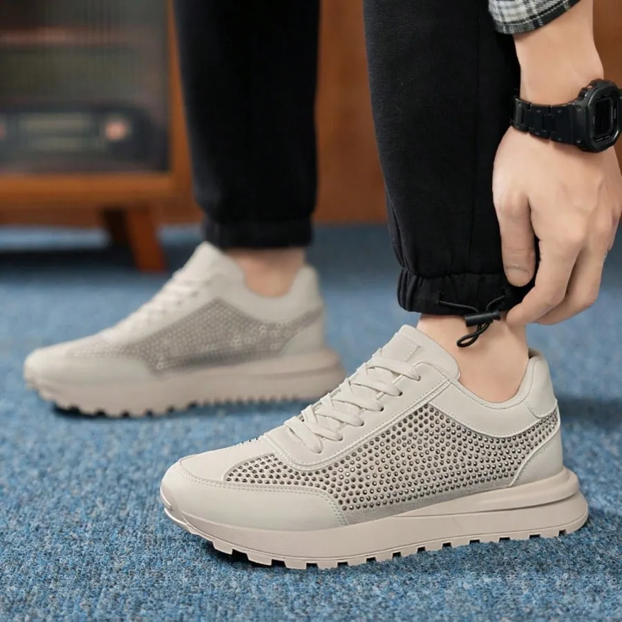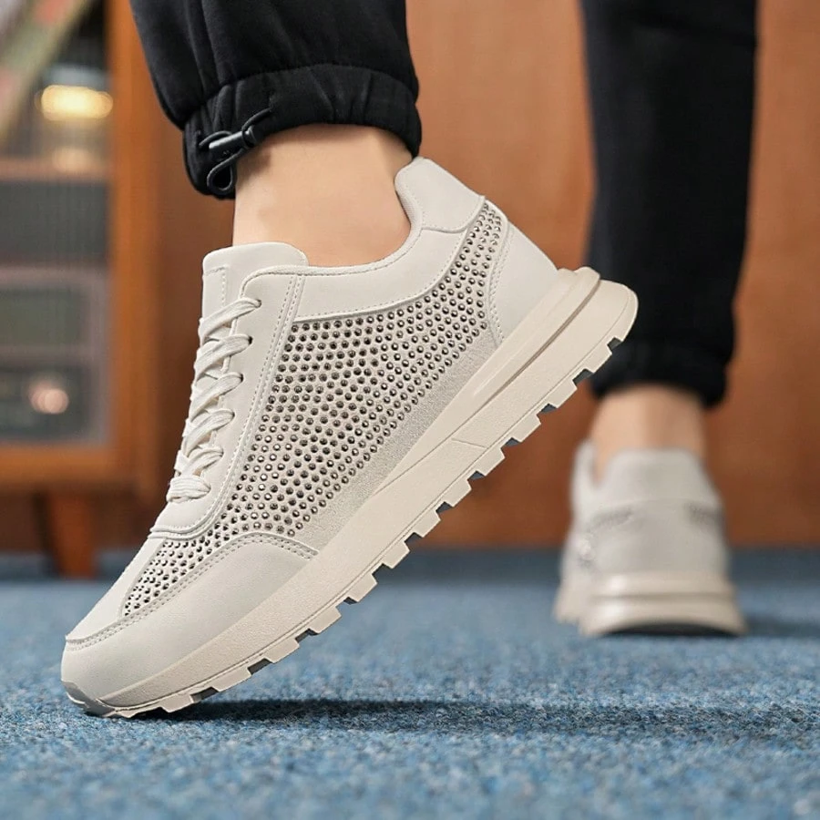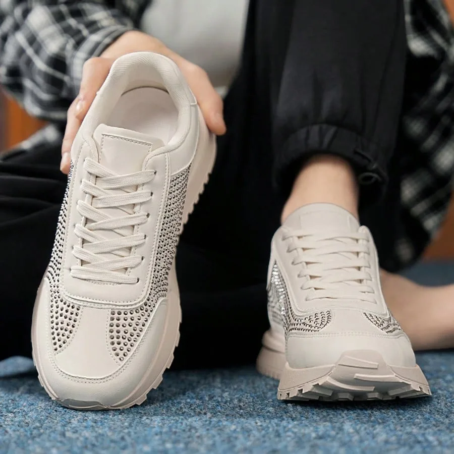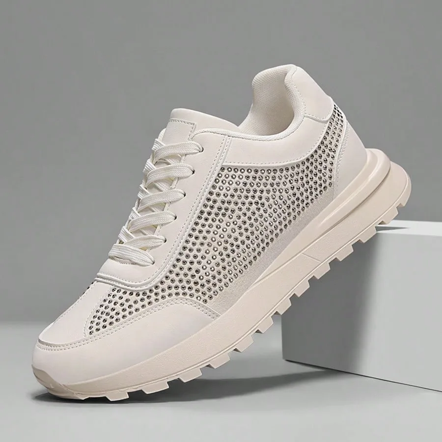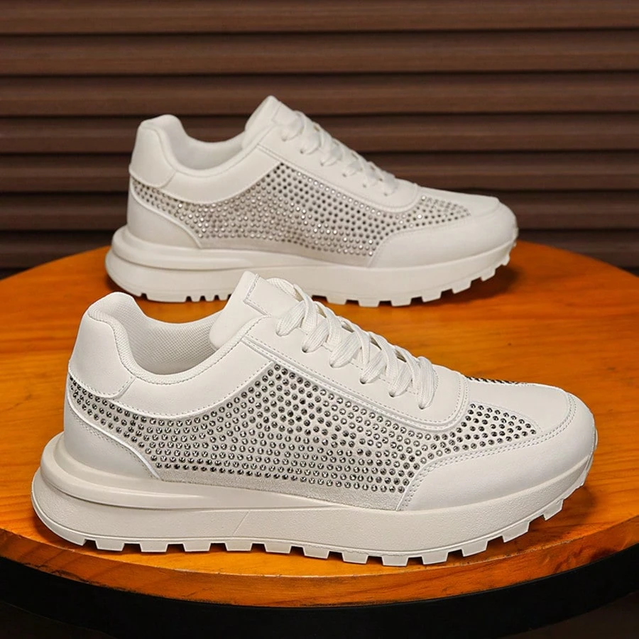 These white low-top sneakers feature a sleek silhouette enhanced with shimmering rhinestone panels along the sides and toe area. The lace-up closure and durable platform sole provide stability and comfort, while the sparkling accents add a stylish touch suitable for casual wear and standout everyday outfits.