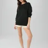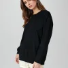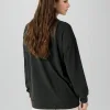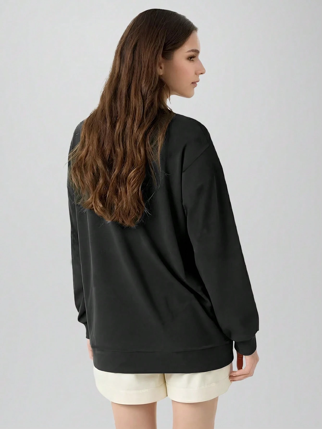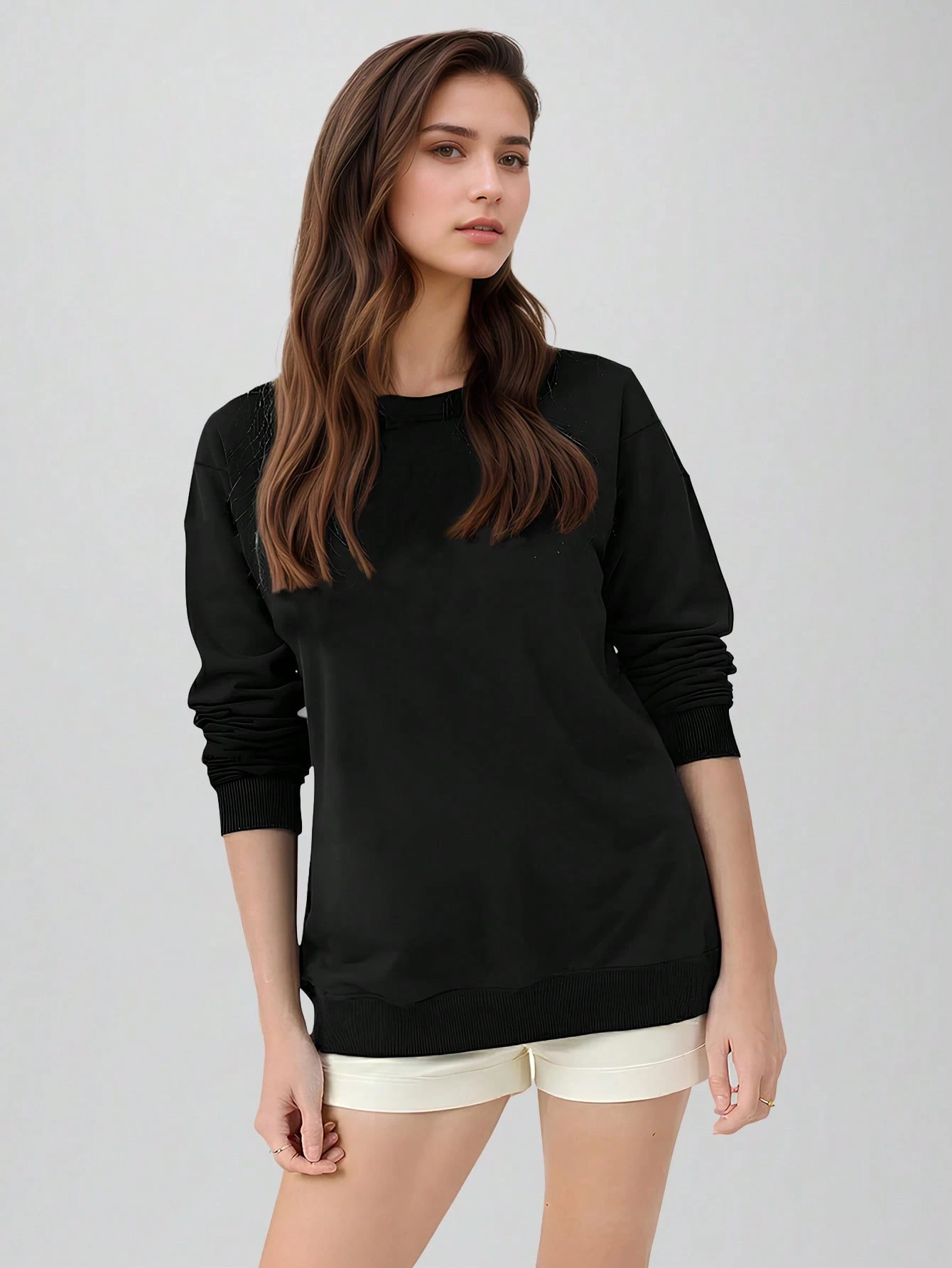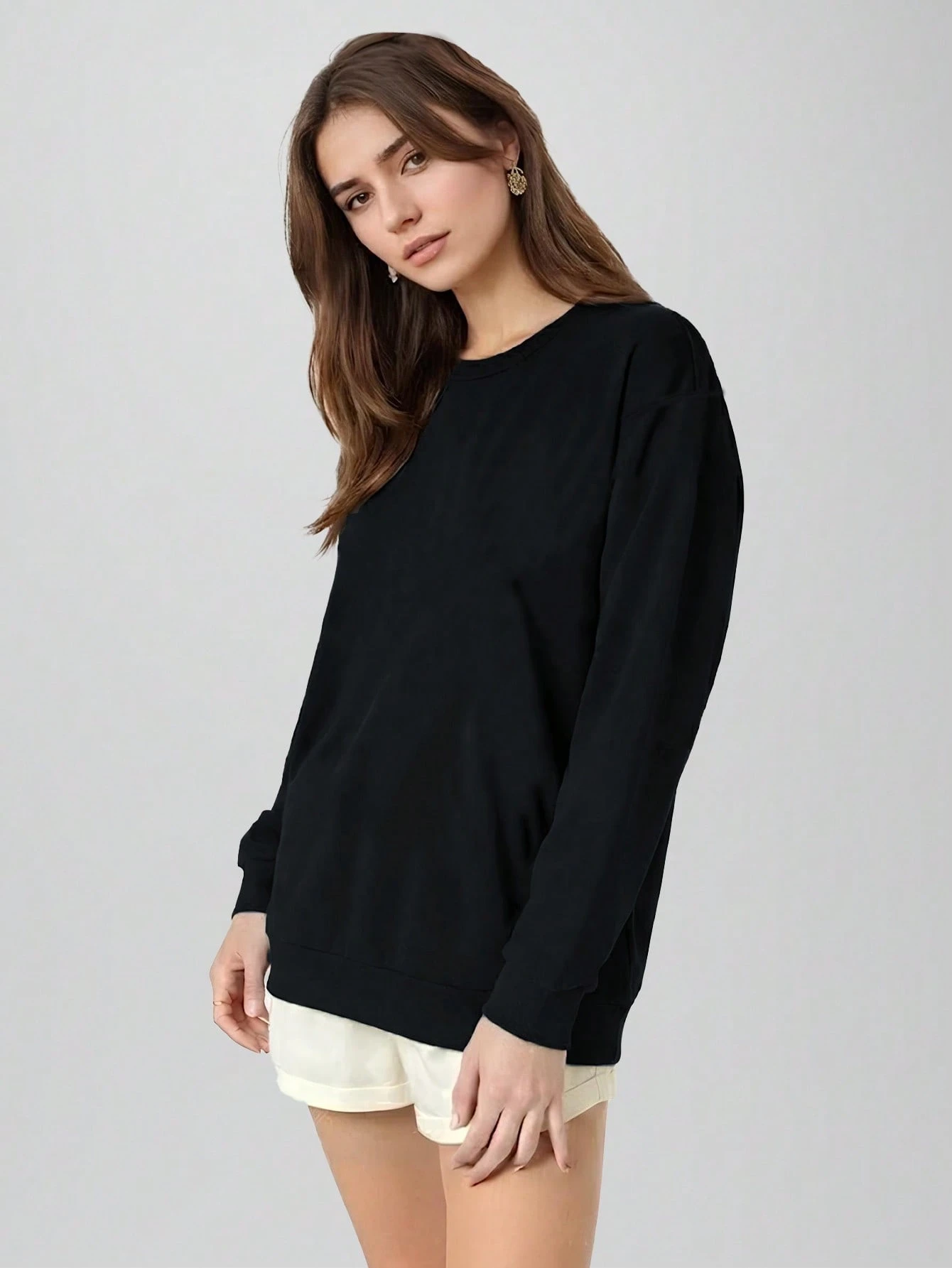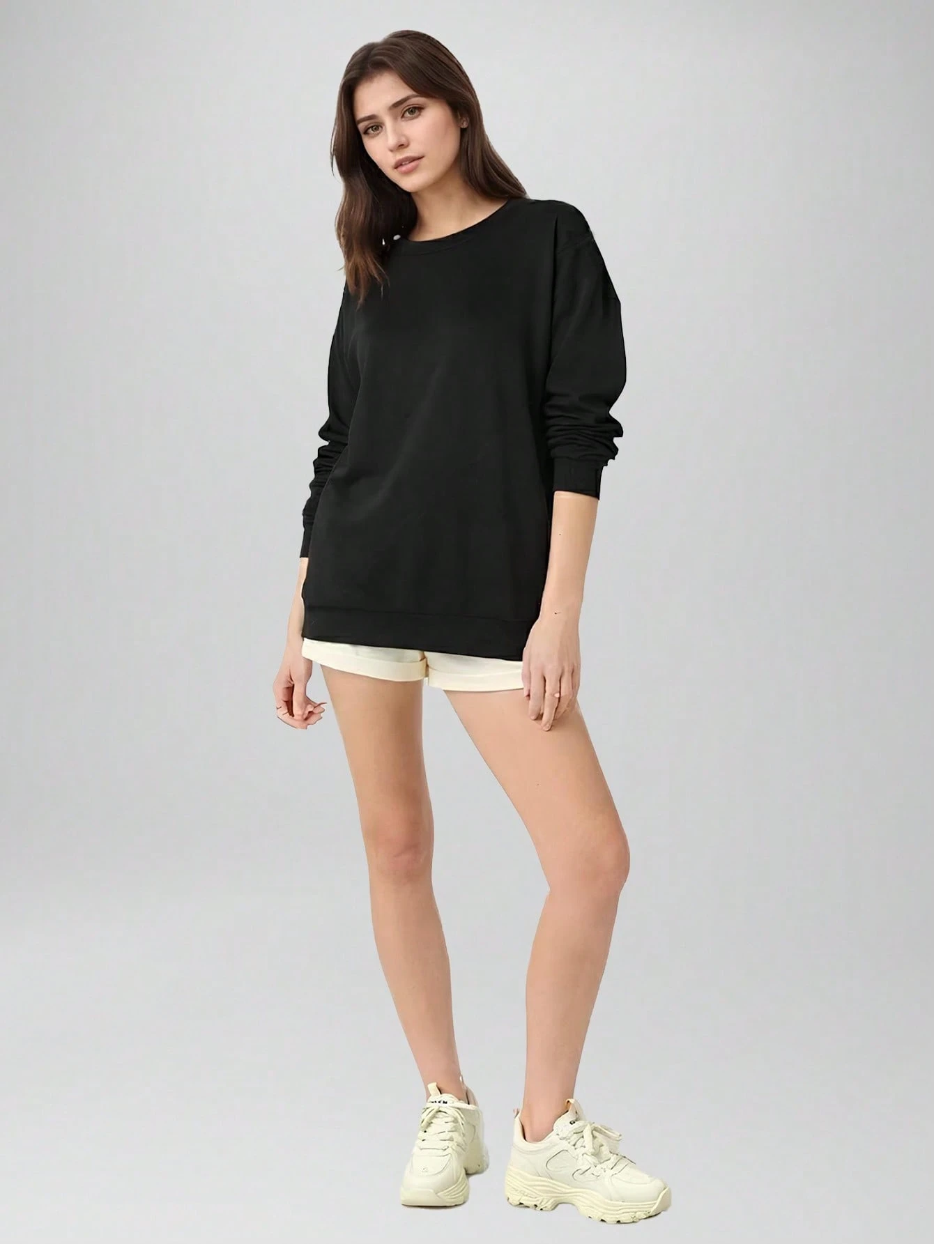 This black pullover sweatshirt features a clean and minimalist design with a relaxed silhouette. The soft fabric, ribbed cuffs, and hem provide a comfortable structure, while the classic round neckline and long sleeves make it a versatile piece suitable for everyday casual wear.